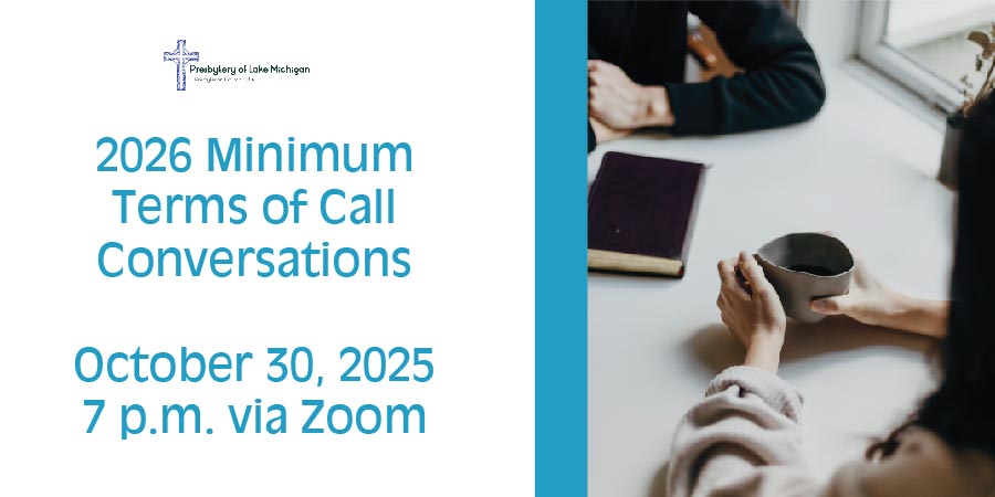 Rev. Ben Rumbaugh (COM Moderator) and Rev. Kristin Stroble (COM Support Staff) will be leading a conversation about the 2026 Minimum Terms of Call on October 30, 2025, at 7 p.m. via Zoom. If you would like to join the conversation, please register here.