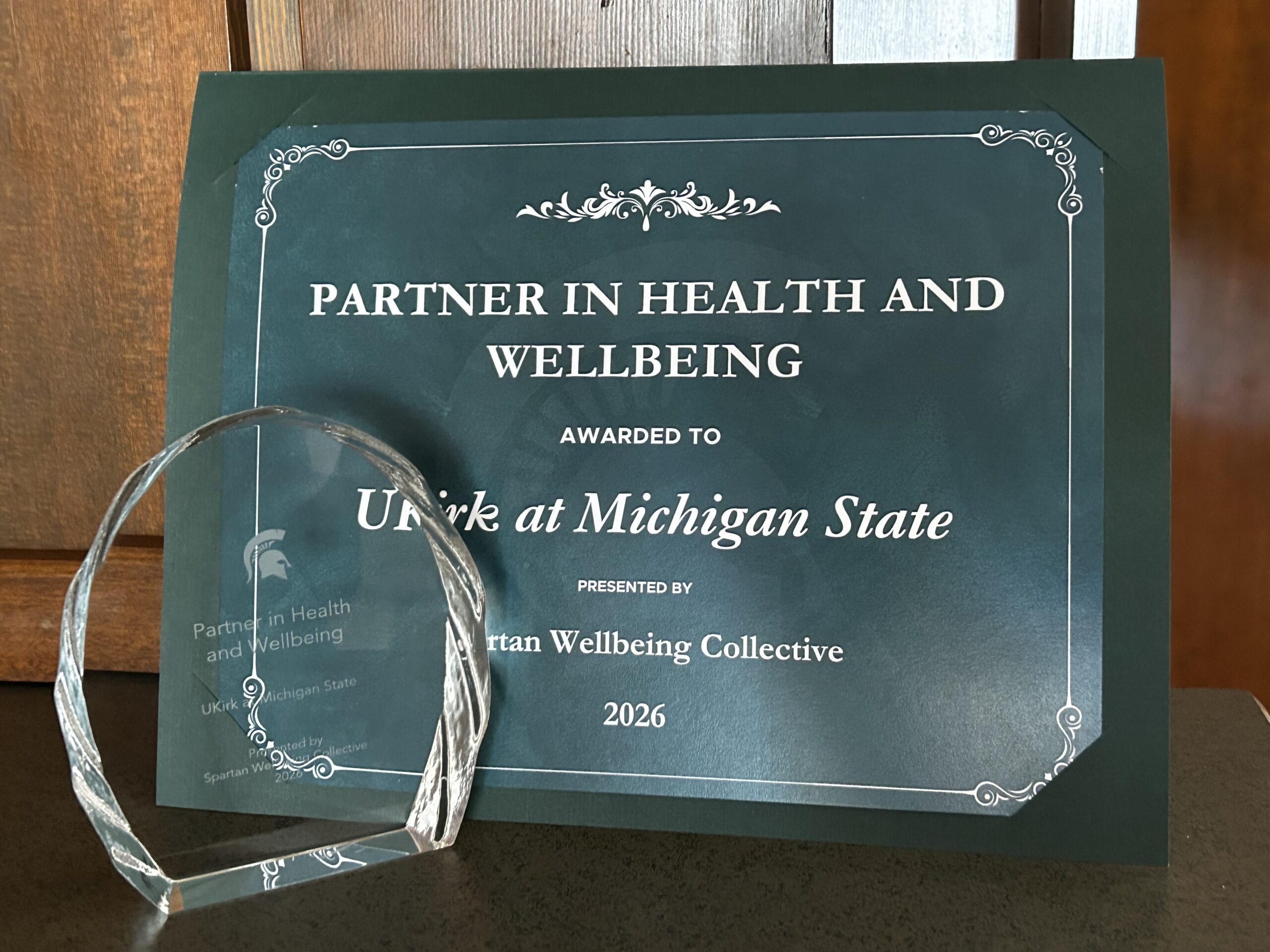 It was the Spartan Wellbeing Summit and MSU honored UKirk at Michigan State with the Partner in Health and Wellbeing Award. The award, given on Feb. 26, recognizes an external partner who demonstrates exceptional collaboration that improves campus health and wellbeing in a lasting manner.
